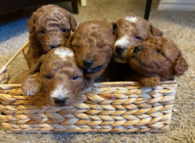 Gretta gave birth to a beautiful litter of Red & Apricot Mini-Multigen Goldendoodle puppies! They went to their forever homes on Sunday, February 12th, 2023.